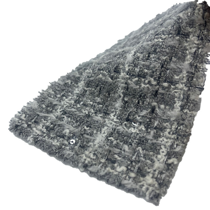 این پارچه که به عنوان ماده 23503 نامگذاری شده است، یک پارچه توید است که از 49% اکریلیک، 40% پلی استر، 7% پشم و 4% نایلون تشکیل شده است. با جرم در واحد سطح 335 گرم در متر، ساختاری سبک و در عین حال ساختار یافته ارائه می دهد. سطح دارای یک الگوی چهارخانه خاکستری ریز است که از طریق فرآیند برجسته سازی به دست می آید که یک بافت برجسته ظریف بر روی پارچه ایجاد می کند. این تکنیک عمق بصری شطرنجی را بدون تغییر پایه بافته شده افزایش می دهد. ترکیب چند الیافی ترکیبی از پایداری پلی استر، انعطاف پذیری اکریلیک، لمس طبیعی پشم و دوام نایلون است. این ویژگیها پارچه را برای لباسهای زنانه مناسب میسازد که در آن الگوهای دقیق و علاقه لمسی مورد نیاز است.